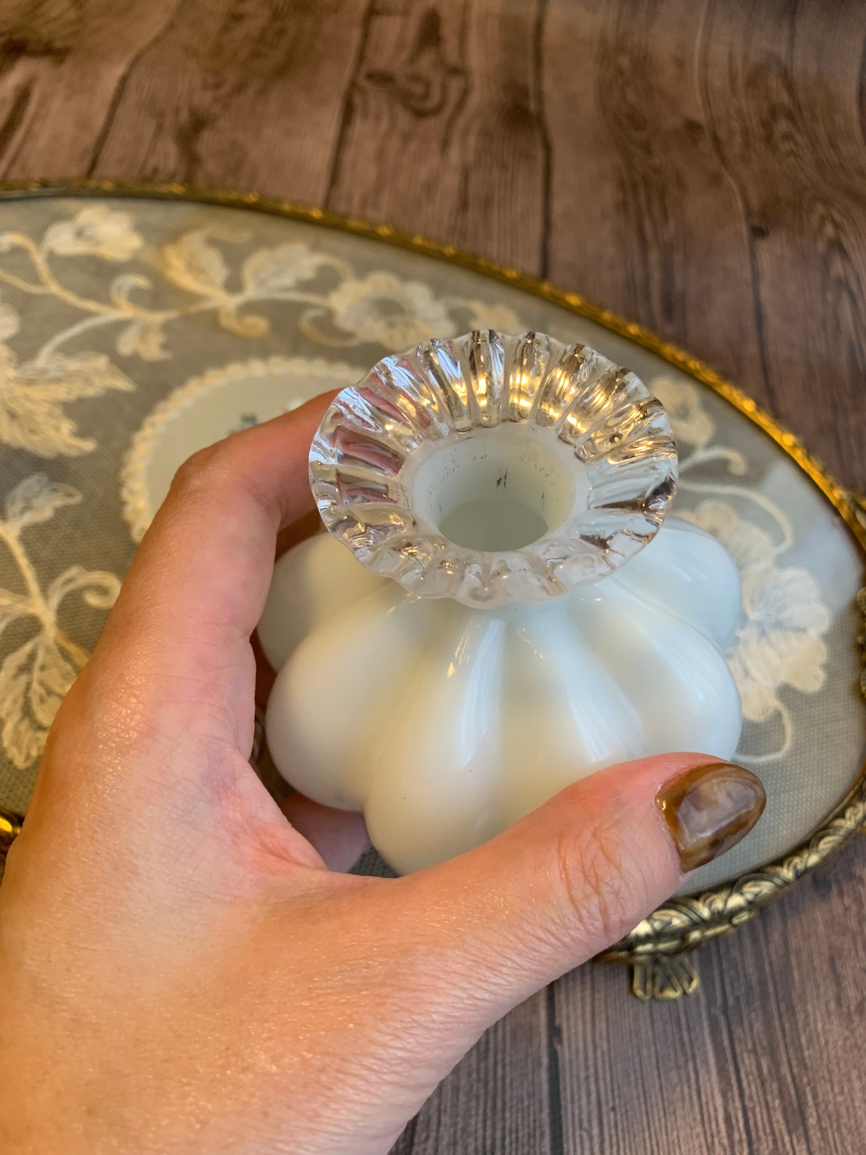 ミルクガラスのメロン型ボトルとクリアなガラス部分のフリルや蓋が美しいデザインです