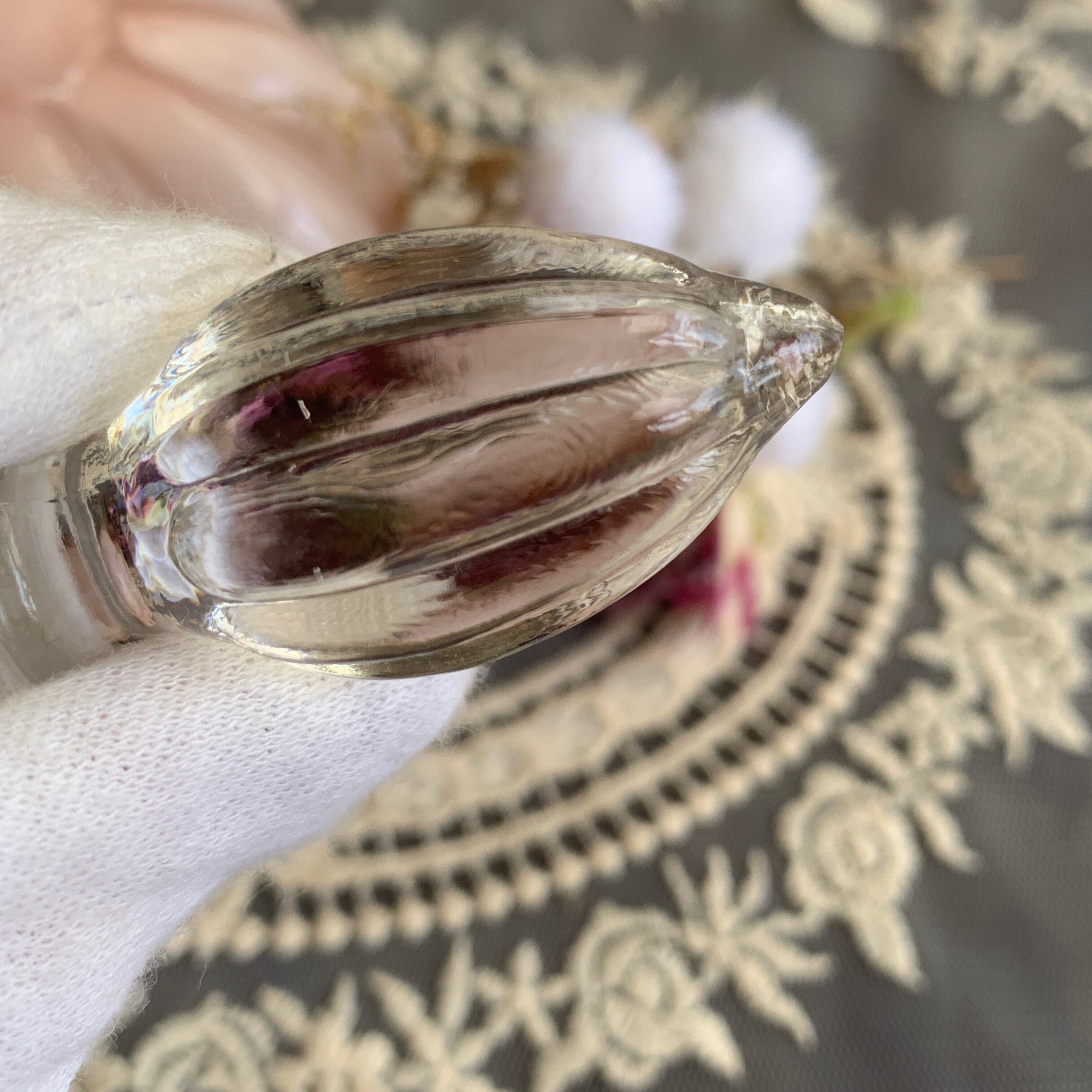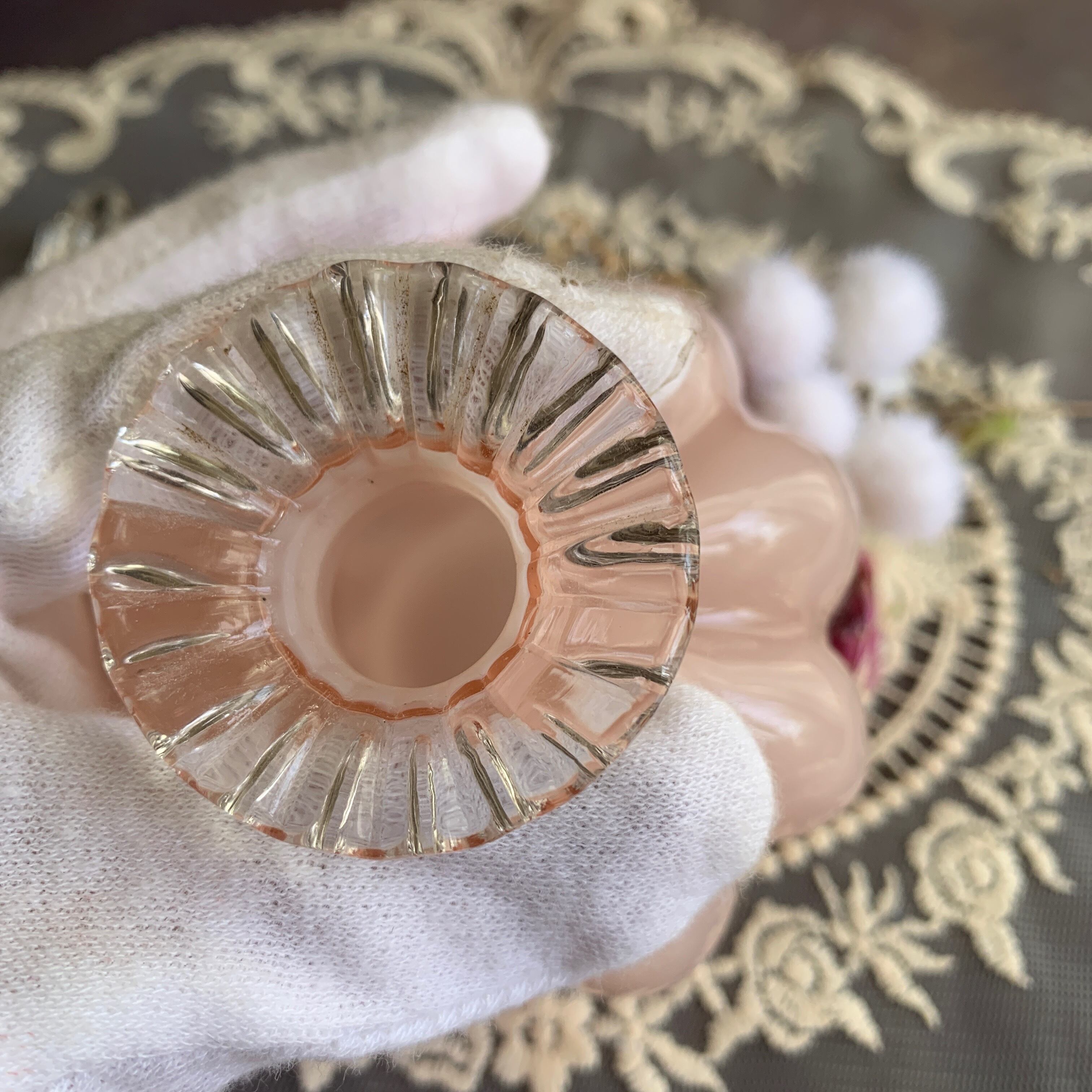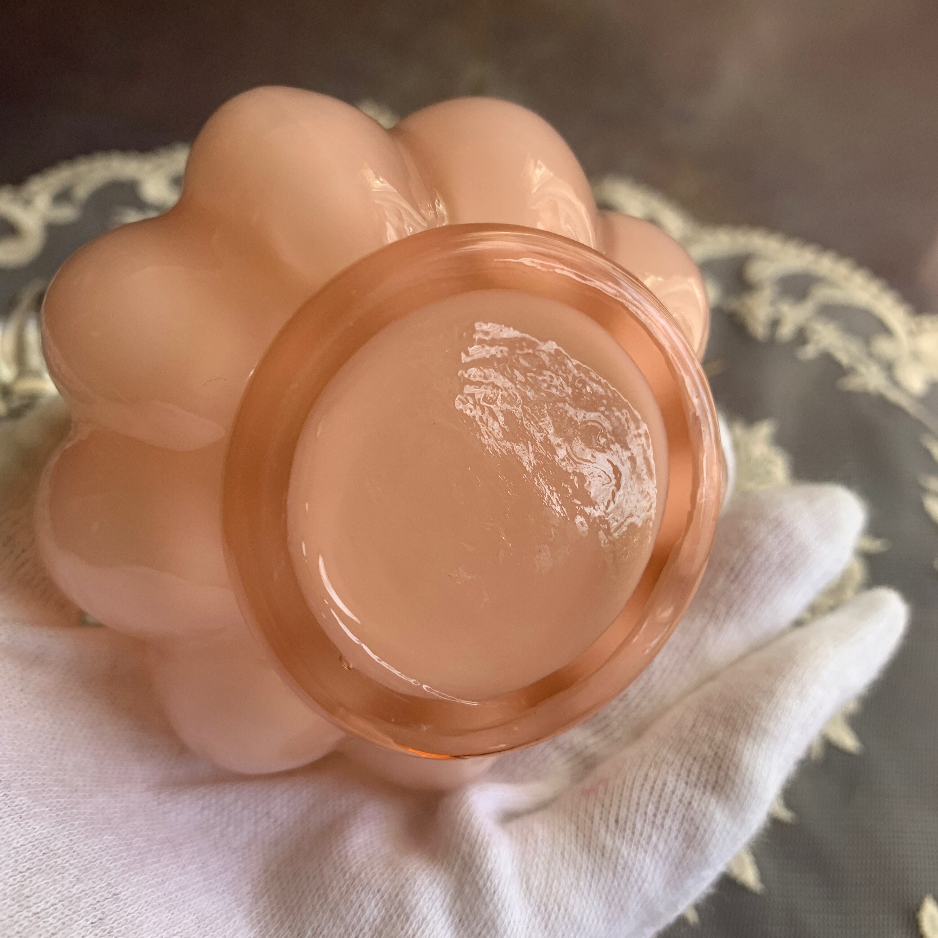 ※オーバーレイは、第二次世界大戦中に作られたもので、ミルクガラスの上に薄いピンク色のガラスをかぶせて作られたガラスです