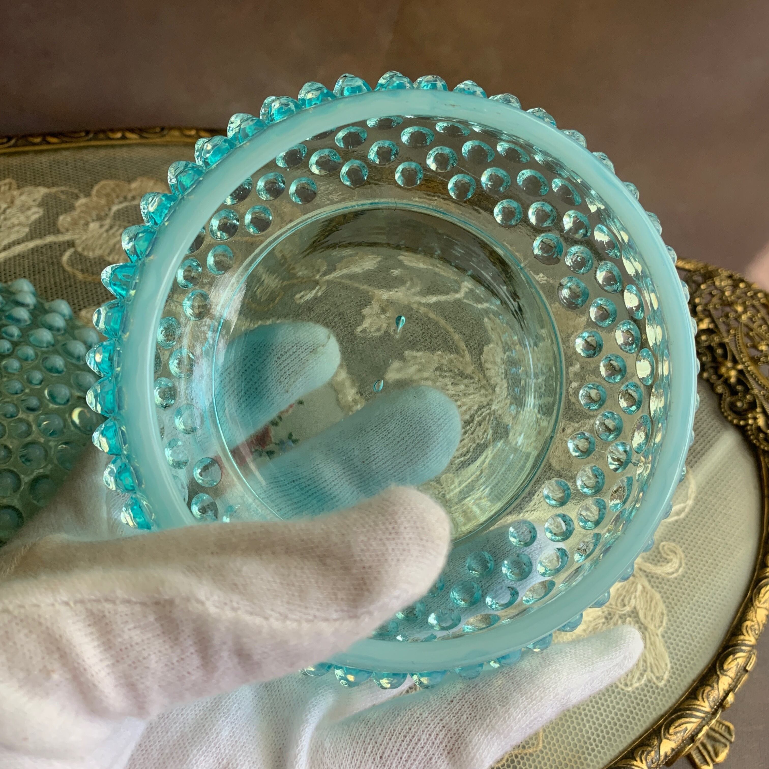 1940年代に製作したブルー オパールセント ホブネイルのコットンジャーです