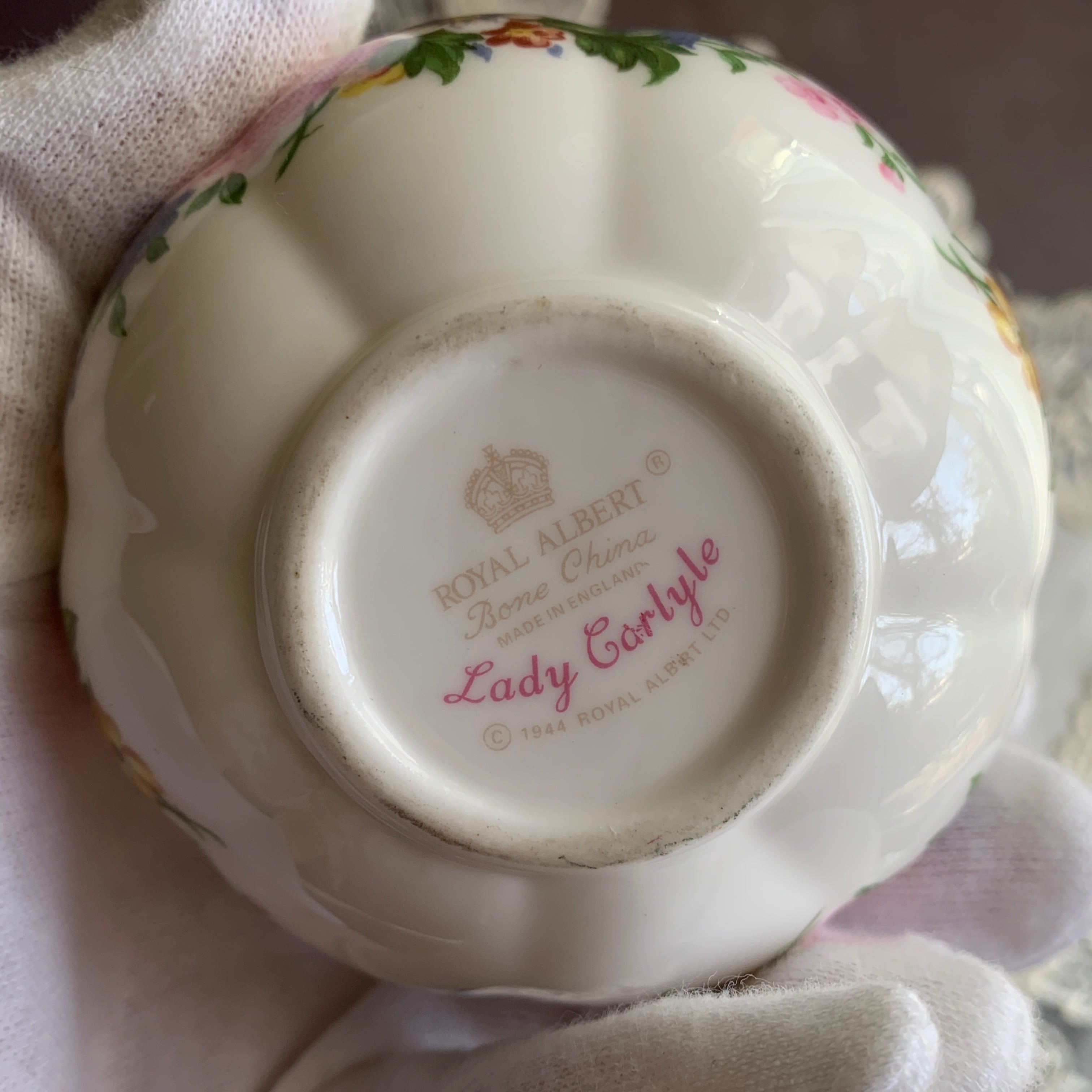 「レディー カーライル(Lady Carlyle)」は、ブルーベル、忘れな草などの小花とともに、薔薇がアクセントとなり、美しい金彩がほどこされています