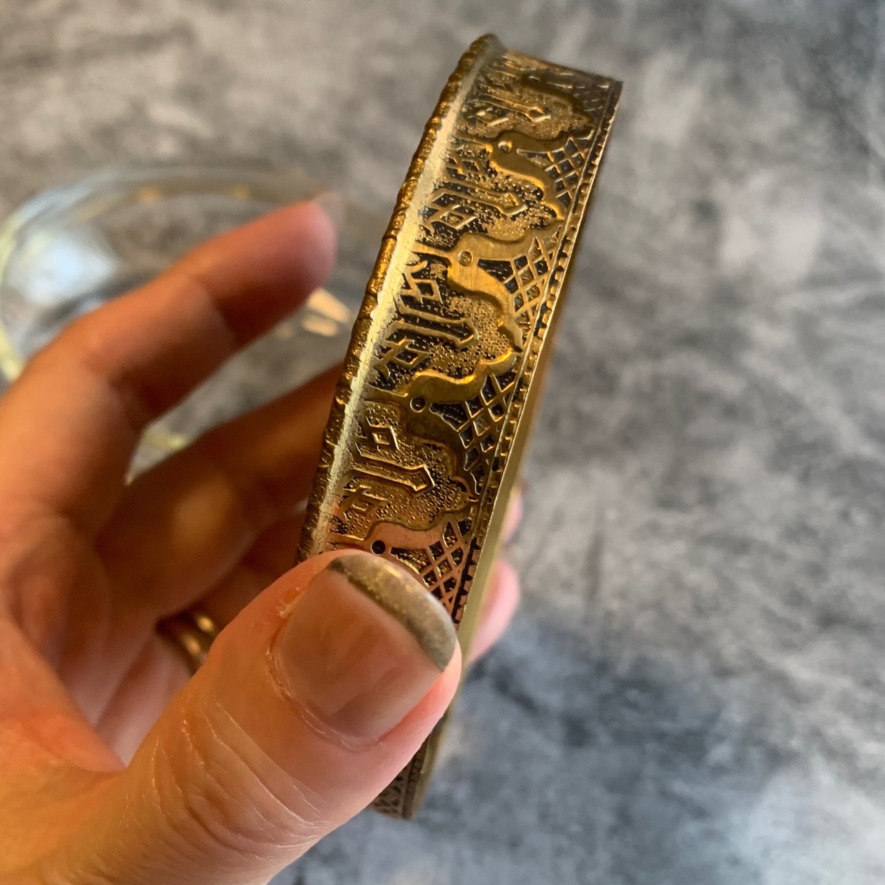 蓋表面には織物にも見える、大変美しい刺繍と真鍮の装飾が大変美しい一品です!