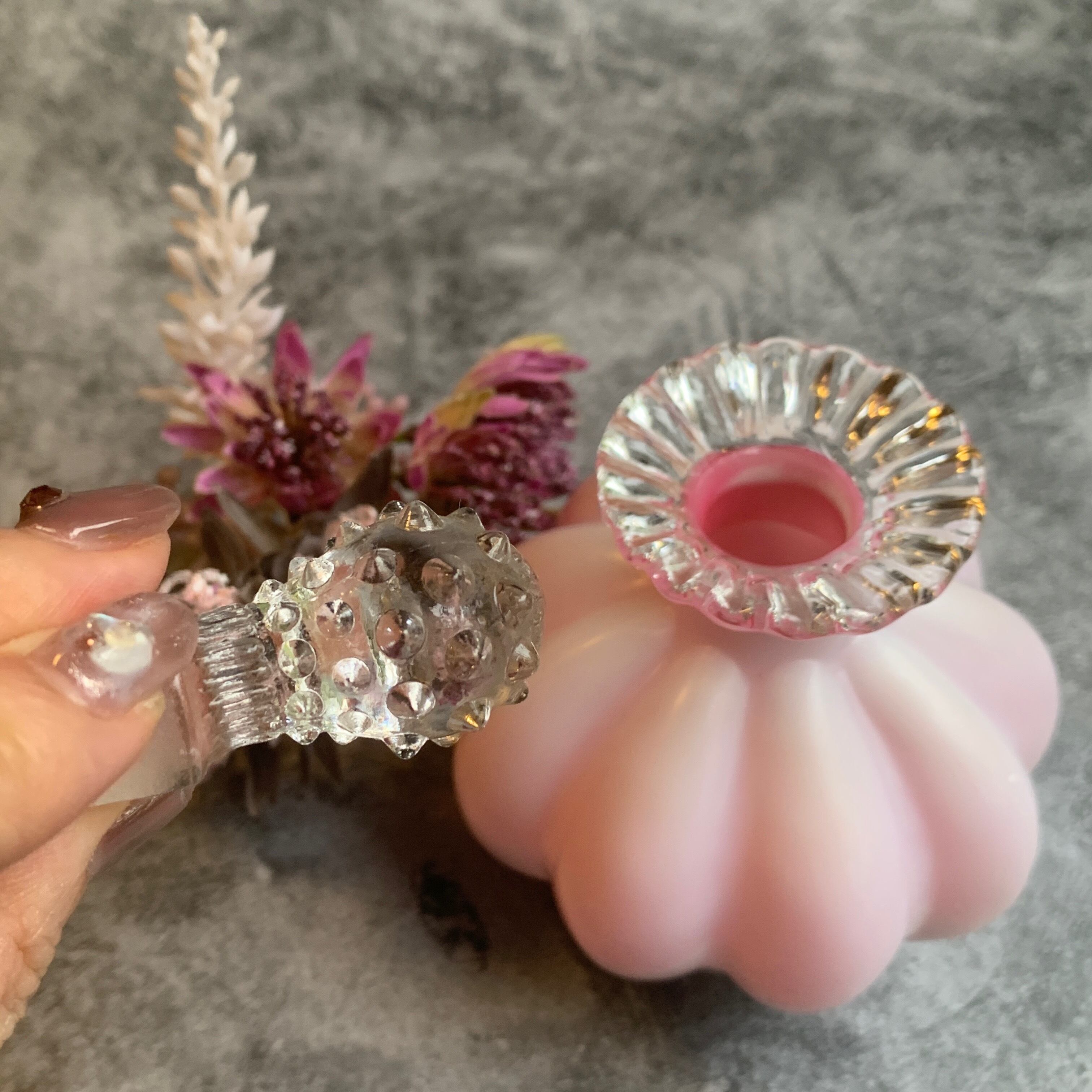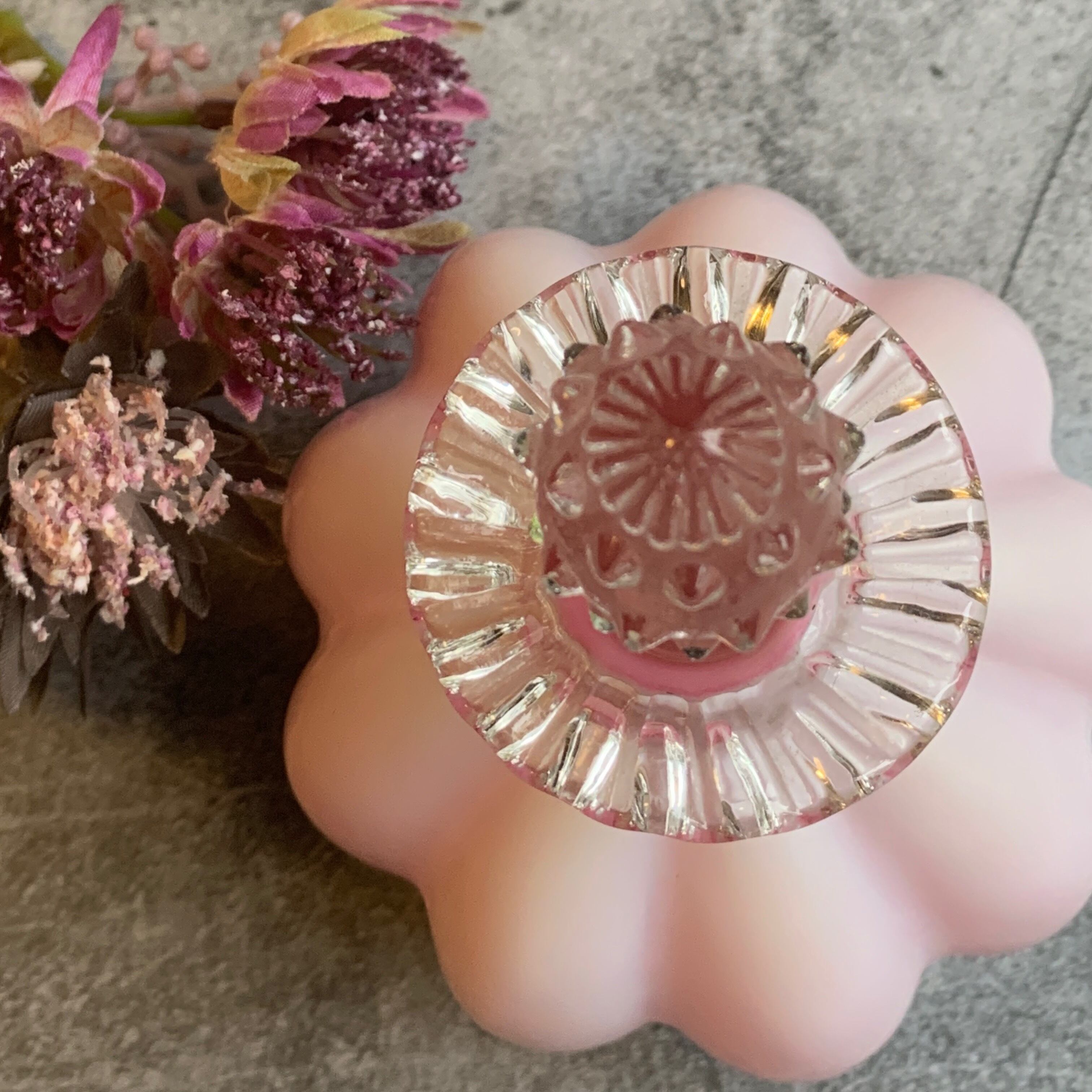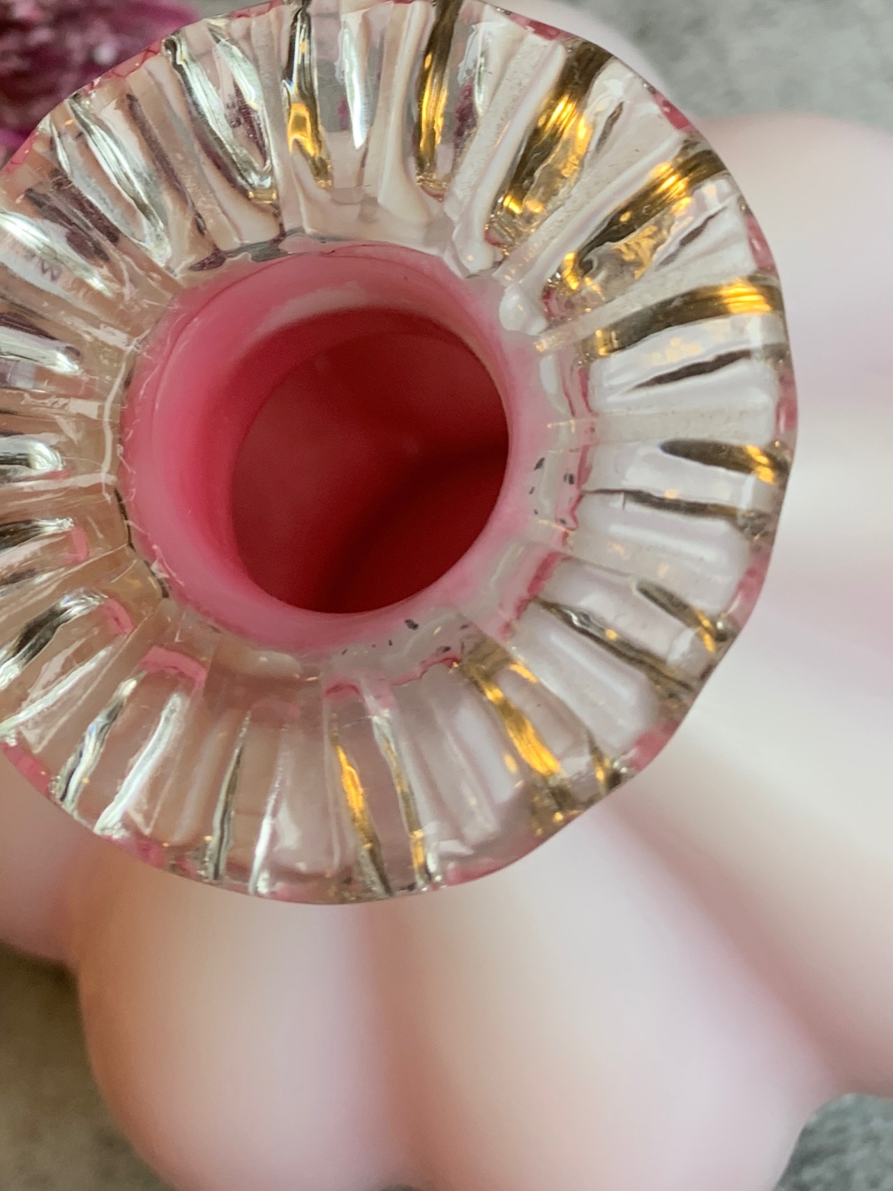 ※オーバーレイは、第二次世界大戦中に作られたもので、ミルクガラスの内側にピンク色のガラスをかぶせて作られたガラスです