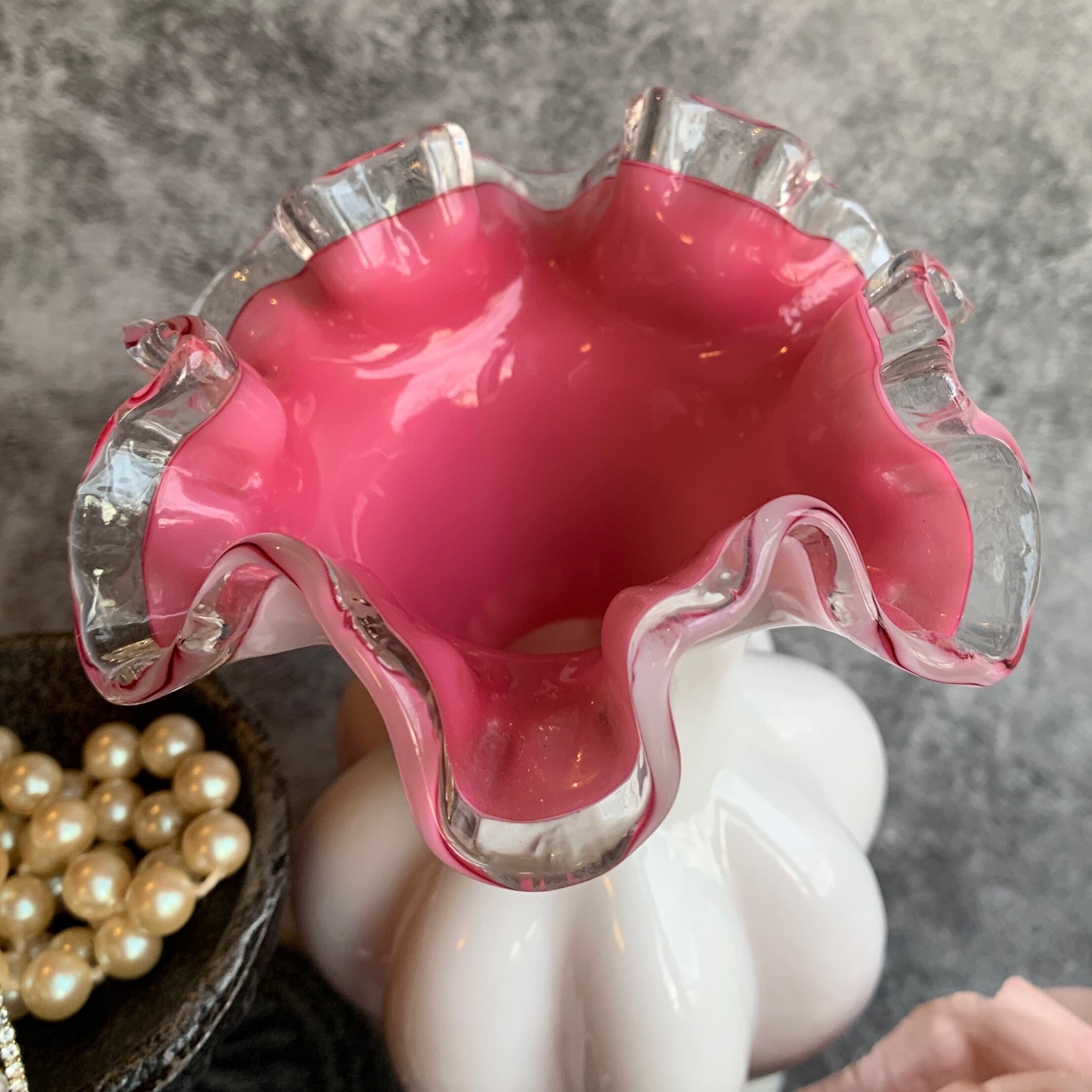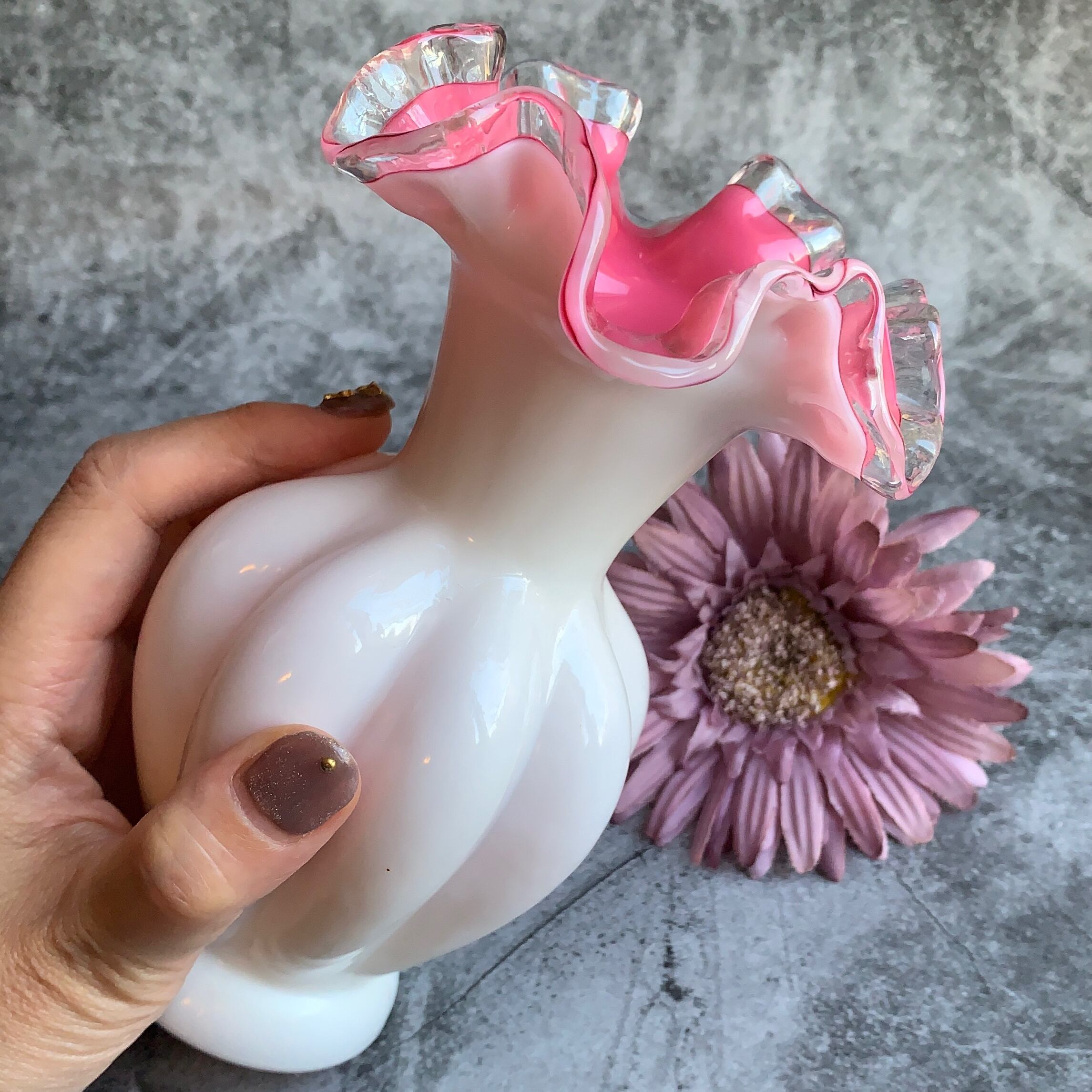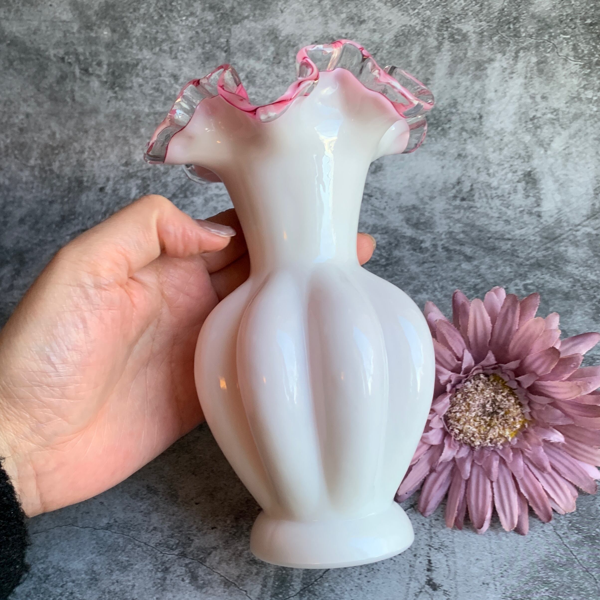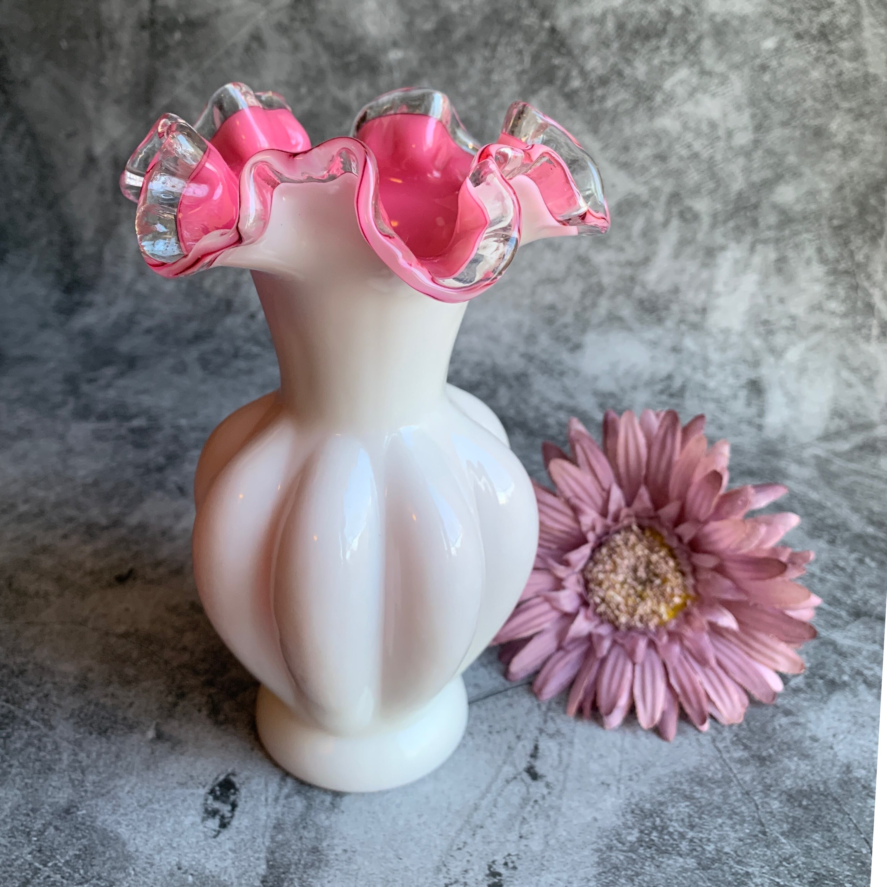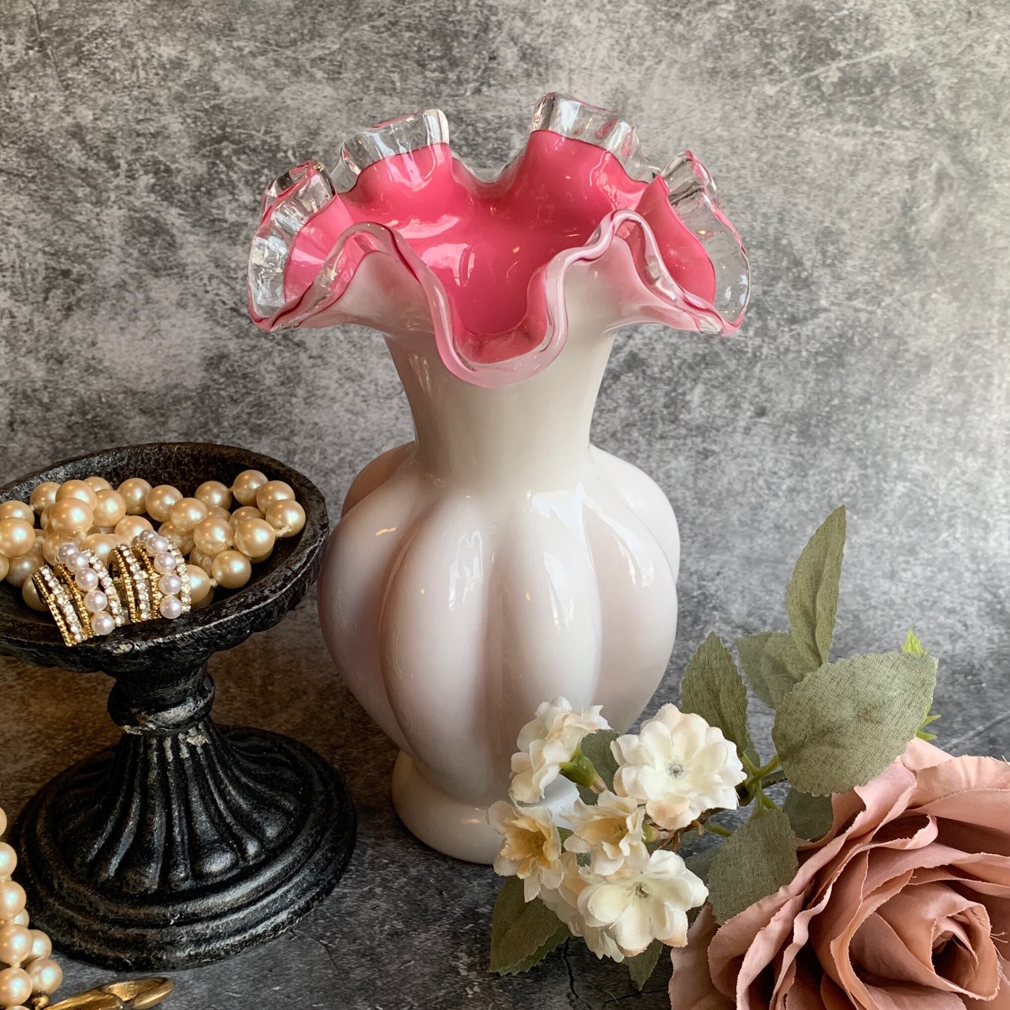 フェントン社✴︎シルバークレストホワイトフリルピンクフラワーベース